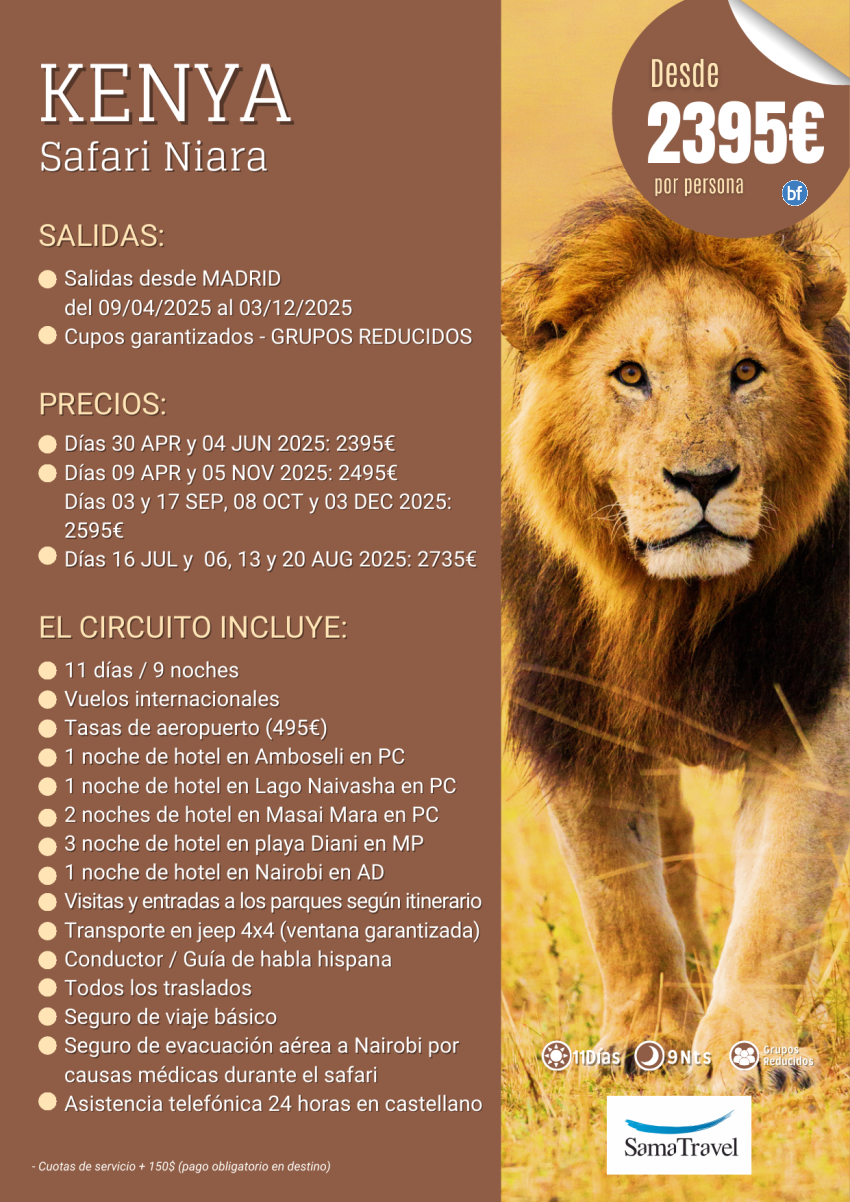 KENYA "Safari Niara+Playa": 11 días con Amboseli, Lago Naivasha, Masai Mara, playa Diani, Nairobi, *dsd 2595€*