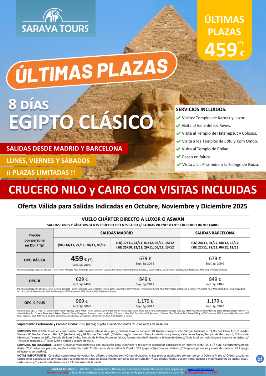 Últimas Plazas! Egipto Clásico 8d. Vuelo directo, Crucero Nilo y Cairo con Visitas dsd 459€. Plazas limitadas